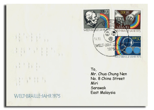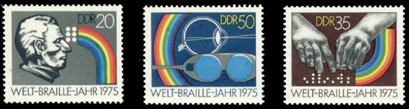 in this East German FDC. The stamps features respectively: a statute of Louis Braille; a pair of hands reading Braille; and a schematic diagram of an eyeball and a pair of glasses.