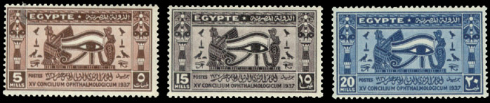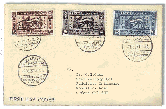 The stamps show the Eye of Horus in different colours. According to the ancient myth, the rivalling god Seth (God of darkness) tore Horus' eye out. Seth was Horus' uncle, who contended with Horus for the Egyptian throne after he killed and dismembered his father, Osiris. Thot, the Moon God and the patron of sciences, put it back in order and healed it. Each part of the eye is made up of a commonly used symbol in Egyptian hieroglyphic. Their total, corresponding to the restoration of the eye brought about by Thot, should have added up to a whole. In fact, the total of the six fractions used results in only 63/64; it was assumed that Thot had withheld the missing 1/64 by magic. This symbol is much loved by the Egyptian and is commonly used in stamp designs. The FDC was issued in 1937 to mark the 15th International Congress of Ophthalmology.