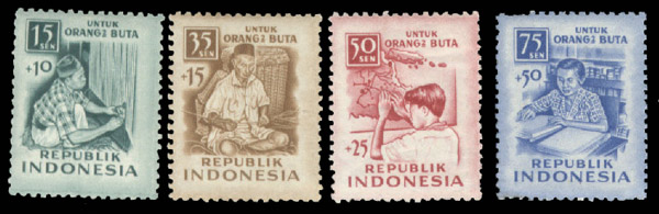 feature blind people in the Blind Institution in Bandung, Central Java. From the left: a student reading Braille, a young man reading a map, a blind basket weaver and a blind carpet maker.