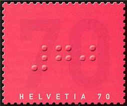 National Association of and for the Blind (SNAB). The '70' is in faint notation on red background and Braille symbol for '70' (number symbol, then Gand J, the 7th and 10th letters of the alphabet for 7 and 0). The printed '70' is designed to be faint, to highlihgt the problems faced by visually impaired people. a