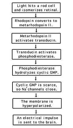 The following is a flowchart outlining the major steps in the vision signal transduction cascade which occurs between the isomerization of retinal (which leads to the formation of metarhodopsin II, the first reactant in the process outlined in this figure) and the interpretation of a visual image by the brain.
