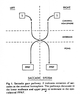 The four subsystems are: (1) Saccadic or fast eye movement subsystems (1) Saccadic or fast eye movement subsystems The rapid versional (conjugate) eye movements are under both voluntary and reflex control. Examples of voluntary saccades are willed refixations and those in response to command, eg "Look to the right"; "Look up". The sudden appearance of a peripheral object or an eccentric sound may evoke a reflex saccade in the direction of the stimulus. In the usual situation these saccades are accompanied by head movements in the same direction. However, in both clinical examinations and most physiologic experiments, the head is stabilized. The visual stimulus for a saccade is target (object) displacement. Following an instantaneous change in target position, the human ocular motor system will respond with a saccade after a latency (delay) of 200 to 250 msec. Both the peak velocity and the duration of the saccade are dependent upon the size (amplitude) of eye movement, varying from 30 degrees to 700 degrees/second respectively, for movements from 0.5 degrees to 40 degrees in amplitude. Saccades are conjugate and ballistic. The physiological control system responsible for their generation is discrete, that is, at discrete instants in time, control decisions are made based upon the continuous inflow of visual information from the retina; these decisions are essentially irrevocable: once the eyes are in motion their trajectory cannot be altered. The control signal is retinal position error, which is reduced to zero by the negative feedback nature of this subsystem. After an appropriate latency, the saccadic response to target displacement