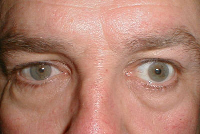 Observation: 3 You are asked to carry out pupillary examination on this patient. Observation reveals this appearance. What is the most likely diagnosis? Answer Right Horner's syndrome. A casual look may suggest left exophthalmos. However, a careful observation reveals right miosis with ptosis and upward movement of the right lower lid causing an apparent enophthalmos. Return to observation