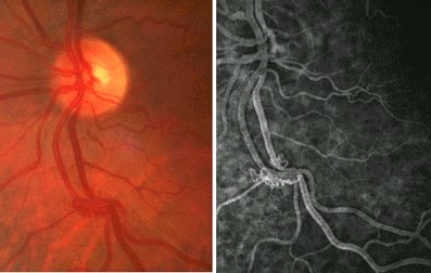these structures to falsely appear fluorescent. The optic disc, myelinated