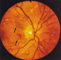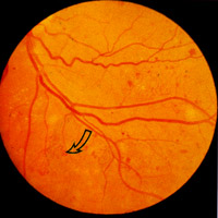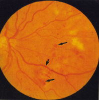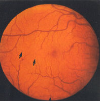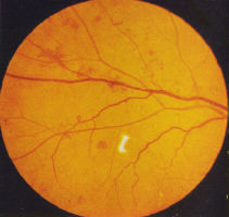 moderate and severe (Fig 3). Splinter haemorrhages are also seen in combined hypertensive/diabetic retinopathy (Fig 4). Some grading centres consider a minimum of 4 microaneurysms are required to diagnose background retinopathy and that they should be bilateral. Exudates, more common in NIDDM, are waxy yellow deposits with discrete edges, extending to the equatorial fundus often in clusters or forming circinate patterns whose centre may be a leaking microaneurysms (Fig 5). 'Cotton wool spots' (CWS), previously called soft exudates, are fluffy white lesions representing infarcts of the nerve fibre layer hence are only found in the posterior retina where the nerve fibre layer is of appreciable thickness (Fig 6). They may appear suddenly during periods of changing glucose regulation and in association with hypertension.