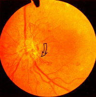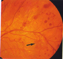 . Other signs of preproliferative retinopathy retinopathy are dilated capillaries which can mimic new vessels but are better described as intraretinal microvascular abnormalities (IRMA) (see Fig 4). They frequently occur adjacent to CWS's, and may be associated with other signs such as 'omega' venous loops (Fig 9), venous reduplication and white lines which represent occluded arterioles (Fig 10). According to the Early Treatment for Diabetic Retinopathy Study (ETDRS) report, preproliferative retinopathy is definitely present if the signs conform to the 1-2-3 rule: i.e.. the presence of venous beading and/or IRMA and/or large blot haemorrhages in 1-3 quadrants of the fundus. .