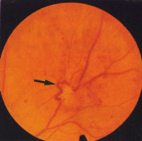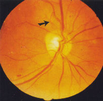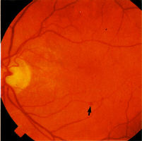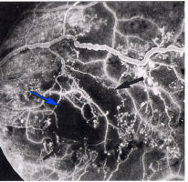 . Venous dilatation may occur as an early sign (see Fig 3) but become more pronounced as more of the capillary bed is closed. A general dilatation of the veins is observable even when the retinopathy is very mild and is to be distinguished from venous beading which is a sign of preproliferative retinopathy (Fig 7). Beading is indicative of extensive ischaemia of the retina and manifests as saccular bulges in the wall of the vein (Fig 7). Fluorescein angiography will invariably show closure of the capillary bed on either side of the vessel (Fig 8).