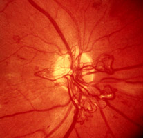 . 2.3 PROLIFERATIVE DIABETIC RETiNOPATHY (PDR) Proliferative retinopathy (PDR) usually appears late in the disease. However, PDR may occur with little warning in young adolescent or post adolescent individuals and have a particularly aggressive course. These individuals require extensive counselling (see below). It is important to emphasize that new vessels by themselves rarely produce symptoms; their sequelae are the cause of visual loss. New Vessels mostly arise from the venous side of the circulation and are recognizable by their abnormal location and their unusual pattern (Fig 11). Unlike normal vessels which have a branching pattern that divides dichotomously, new vessels form loops or rete (arcades). While norm vessels appear to be supplying or draining an area of retina, it may be difficult to identify such a role for new vessels. For example, a rete of vessels may arise from the main trunk of a vein and criss-cross the vessel randomly or a venule may arise from the disc and after forming a tortuous loop wind back towards the disc (Fig 12, 13). Early new vessels usually lie flat on the surface of the retina, but when the vitreous is detached, they are drawn forward as a result of vitreous traction. . New vessels arise from the disc (NVD) (Fig 13, 14, 15) or the retina (NVE) (Fig 11, 12). Most new vessels arise from veins in a central, circular areas about 3½ disc diameter from the disc margin in any of 4 quadrants. Where there is sectoral ischaemia, new vessels characteristically arise at the junction of the perfused and non- perfused area as demonstrated on fluorescein angiograms (Fig 16a, b). In eyes with widespread ischaemia, NVD are common. Disc NVD may be flat or forward depending on the position of the posterior vitreous face. .