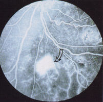 . 2.4.1.3 Ischaemia maculopathy Ischaemia maculopathy is almost a diagnosis of exclusion, based on unexplained visual loss in the presence of a relatively normal looking macula. Blot haemorrhages in the paramacular region may be indicative of ischaemic maculopathy. There may be associated haemorrhages and exudates elsewhere. The exact extent of the ischaemia can only be seen on fluorescein angiography (Fig 21a, b). It is therefore important that patients with maculopathy in which ischaemia is suspected are investigated with this technique. There does not appear to be a direct correlation between visual acuity Dan the degree of ischaemia. .