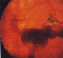 . Untreated NV (D or E) lead to vitreous haemorrhage (VH) and blindness. VH may be subhyaloid before the vitreous is fully detached and present as small 'crescents' with a level superior border if the PVD is present (Fig 17, 18). . In the late stage of the natural history of proliferative disease, fibrous tissue (gliosis) gathers around the new vessels and contraction of this tissue causes repeated bleeding and eventually, tractional retinal detachment. Occasionally, fine epiretinal gliosis occurs with minimal traction on the retina but this is uncommon. .