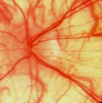 to wreathe the fovea). The retina is hypopigmented making the choroidal vasculature easily visible.