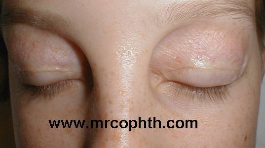 This 25 year-old woman suffers from recurrent swelling of the upper lids leading to thinning of the skin and excessive upper lid skin. Histology showed subacute inflammation of the skin.