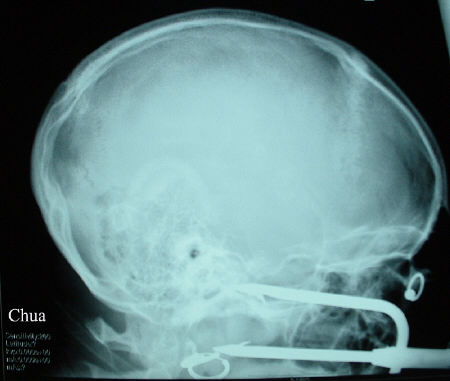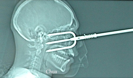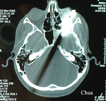 globe perforation. CT scan showed the prongs narrowly missed the brain.