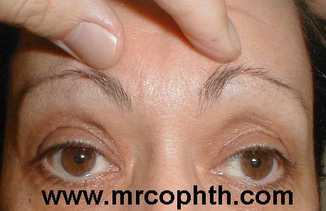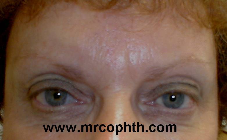 Patient 1: medial dermatochalsis and smooth forehead |