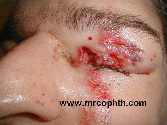 This 24 year-old was hit in the left upper lid with a petrol pump resulting in abrasion and full thickness laceration medially. The canaliculus was not removed.