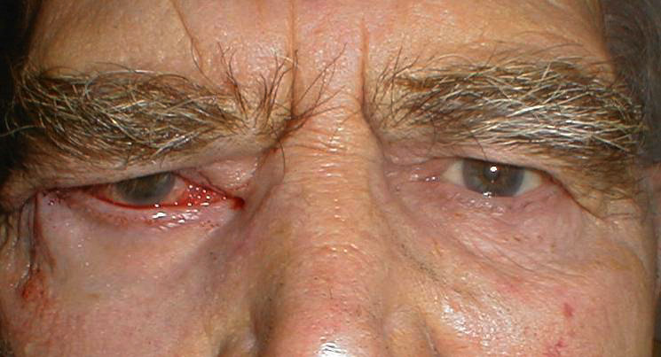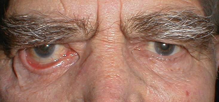 Examination revealed right sided facial muscle weakness and marked right lower lid ectropion. A right tarsal strip procedure was performed by attaching the lateral tarsus to the periosteum 3 mm above the medial canthus. Post-operatively, there was a marked upward slanting of the right lateral corner. This contour is essential for successful outcome as the lateral tarsal strip tend to sack with time. A lower attachment of the lateral strip would have led to a lateral canthus which is lower than the medial canthus and possible recurrence of epiphora. |