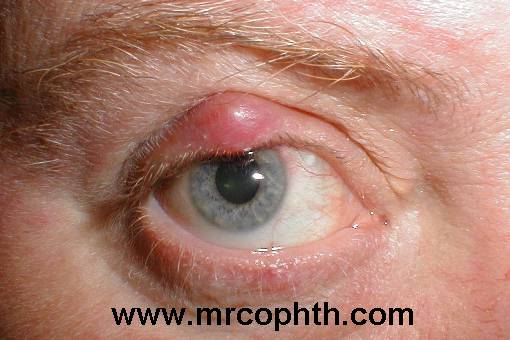 This 50 year-old presented with two swellings in his right eyelids. A large upper lid chalazion and a smaller lower lid chalazion are shown in the top picture. The cysts were incised and currated simultaneously.