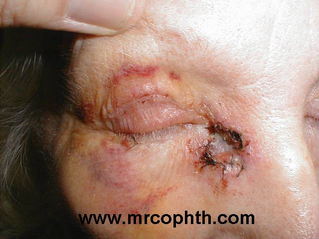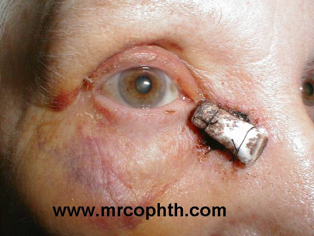 This 74 year-old woman had had a medial canthal basal cell carcinoma excised. The defect was closed with a skin graft taken from the upper lid by performing a blepharoplasty.