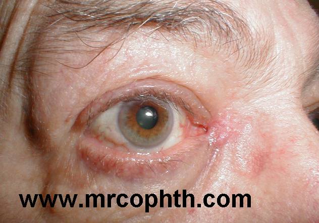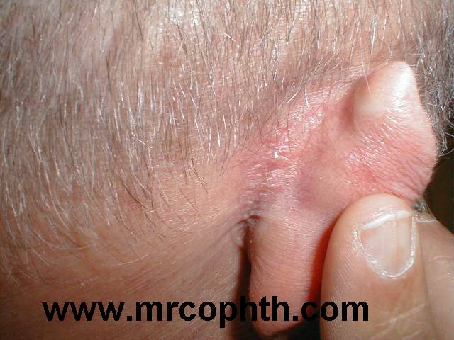This 75 year-old man had had a right medial canthal basal cell carcinoma excised. The defect was covered with post-auricular graft.