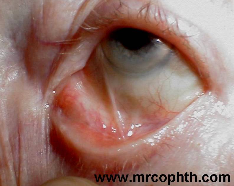 Symblepharon in a 82 year-old woman following severe conjunctivitis secondary to acute meibomian gland infection. The gland was incised and drained. The symblepharon does not appear to cause her any problems.