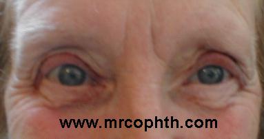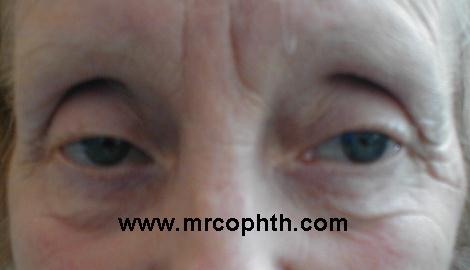 ptosis. The levator disinsertion is shown by the absent of skin crease.