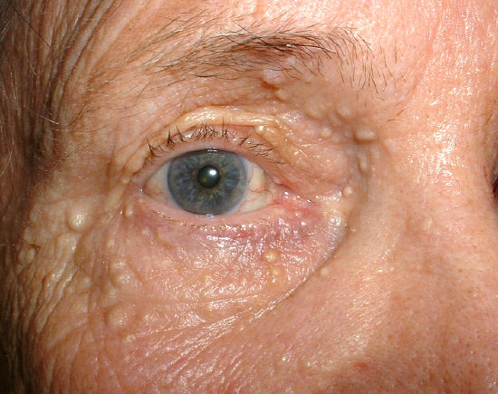 presents with multiple whitish lesions around her eyes of 5 years duration.