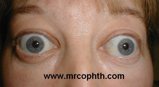 Bilateral thyroid eye disease with proptosis, marked upper retraction and mild lower lid retraction.