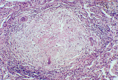 A TB granuloma showing central necrosis (caseating granuloma) and the presence