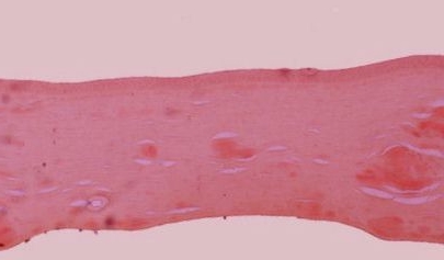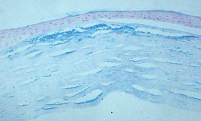 Which stain is used and what is the main abnormality seen? a Answer Alcian blue. The corneal stroma shows diffused deposition of bluish materials. The diagnosis is macular dystrophy. What systemic conditions may be associated with this condition? Name three. a Answer Macular dystrophy occurs in a group of conditions collectively known as mucopolysaccharidoses. They are caused by a specific enzyme defect. Conditions within this group that have cornea involvement include: Hurler's syndrome, Scheie's syndrome and Morquio's syndrome.