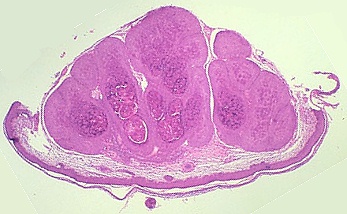 What does the above specimen show? Answer The epidermis contains a dome-shaped, lobulated lesion with multiple inclusion bodies. What is responsible for this appearance? 0 Answer Molluscum contagiosum which is caused by a DNA poxvirus. How may the patient present? 0 Answer Chronic follicular conjunctivitis due to shedding of the viral particles into the conjunctiva.