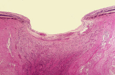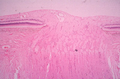 What does the above specimen show? Answer There is loss of the nerve fibre layer and near complete excavation of the optic nerve head. (see pictures at the bottom of the page which compare the above specimen and a normal optic nerve head.) What is the most likely cause for this appearance? a Answer Primary open angle glaucoma.