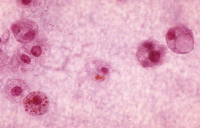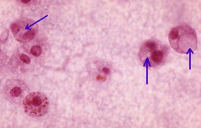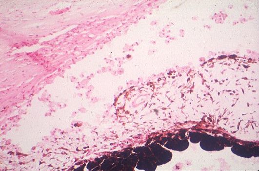 What do the pictures show? Answer The first picture shows numerous round cells in the angle of the anterior chamber. These cells are macrophages. The second picture shows cells containing lens proteins in the cytoplasm. These are macrophages that had phagocytosed lens materials (see picture below). What is the diagnosis? a Answer Phacolytic glaucoma. This condition resulted from the leakage of lens proteins into the anterior chamber. The lens protein came from the liquefied cortex of a hypermature cataract. The raised intraocular pressure is a consequence of blockage of the trabecular meshwork by the lens proteins and the macrophages that phagocytose the lens proteins. How would you manage a patient with this condition? a Answer Removal of the cataract and irrigation of the anterior chamber.