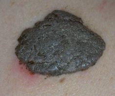 Seborrheic keratosis appears as sharply demarcated, black or brownish