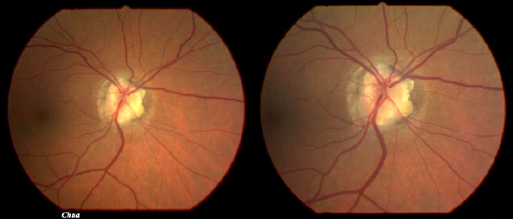 | History: This young patient was referred by the optician because of the appearance of her optic discs. The lumpy shiny yellowish lesions are typical of optic disc drusen. In addition, there are abnormal branchings of the retinal artery. In doubtful cases, autofluorescence or ultrasound can be used to confirm the diagnosis. | |||