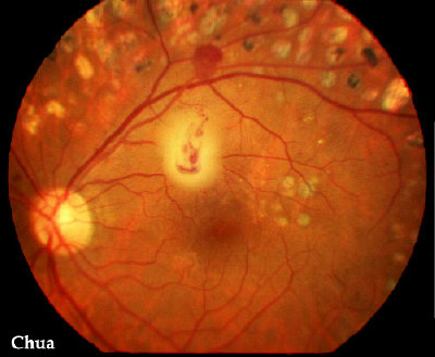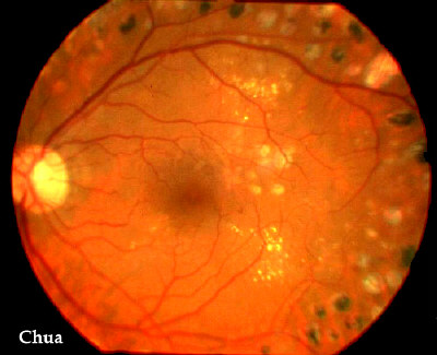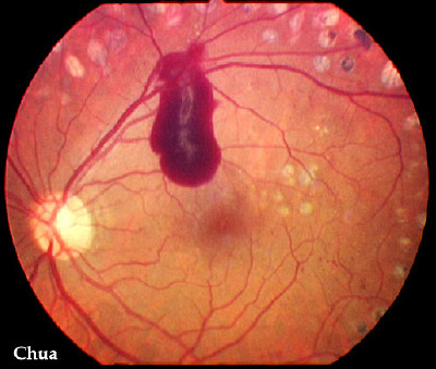 | History: This diabetic man presented with a sudden onset of floaters in his left eye. Examination revealed new vessels along the superior retinal arcade. Further laser photocoagulation caused the vessels to regress (the second picture shows the retina appearance at 6 months after the laser). The vessels resolved completely after one year. | |||
