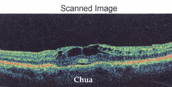 The area of cystoid macular oedema is clearly shown by the OCT (optical coherence tomography) scan. A fluorescein angiography was carried out which showed areas of ischamia in the foveal region without leakage. Argon laser was not performed. OCT is useful in showing retinal thickening and oedema especially in patients where medial opacities make macular view difficult. However, it does not give information about the circulation. In deciding if macular oedema secondary to branch retinal vein occlusion is suitable for laser treatment, fluorescein angiography is essential to exclude ischaemia and to localize area(s) of leakage. |