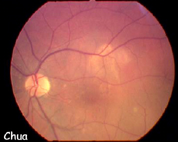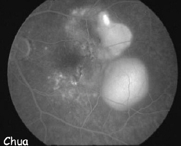 | History: This 74 year-old with a history of bilateral dry age-related macular degeneration presented with a 2-week history of increased right visual distortion. The visual acuity was 6/18. Fundoscopy revealed areas of macular elevation near the fovea. Fluorescein angiogram revealed two areas of pigment epithelium detachments. No treatment was performed. The pigment epithelium detachment resolved spontaneously and the vision returned to 6/12. However, one year later, the patient presented to the casualty with a sudden deterioration of vision. The vision was 6/CF. The fundoscopy showed circinate exudate with subretinal haemorrhage (caused by subretinal neovascular membrane). Fortunately, the left eye continued to have good vision. | |||