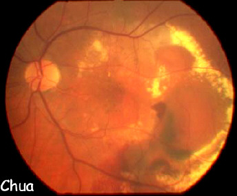 Presentation one year later with exudate and subretinal haemorrhage. |