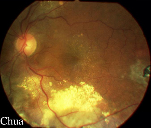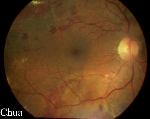 | History: This 58 year-old black man was reviewed in the clinic because of a past history of syphilitic chorioretinopathy. Despite the appearance of the retina, the vision was 6/6 in the right eye and 6/12 in the left. There was no sign of vitritis and the anterior chamber was quiet. The poor vision in the left eye was caused by epiretinal membrane. Fluorescein angiography showed no signs of significant macular oedema. | |||