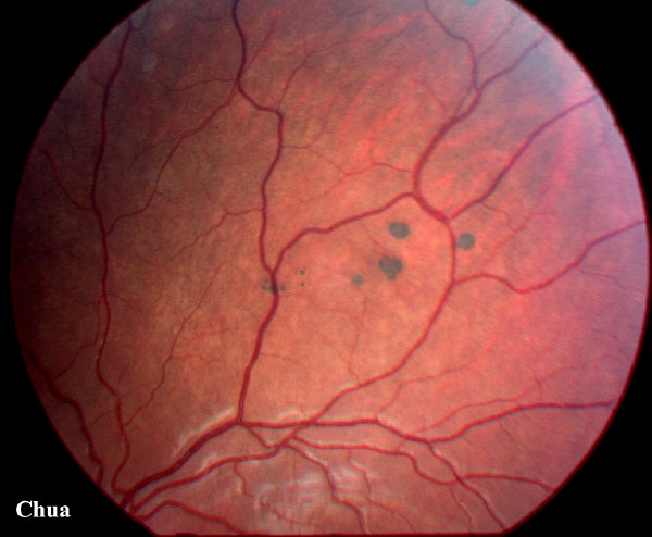 vision was normal in both eyes and fundoscopy revealed multiple rounded