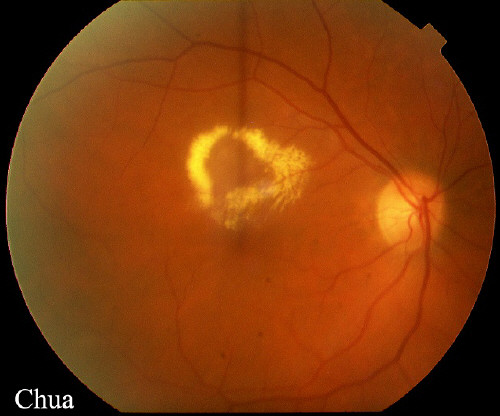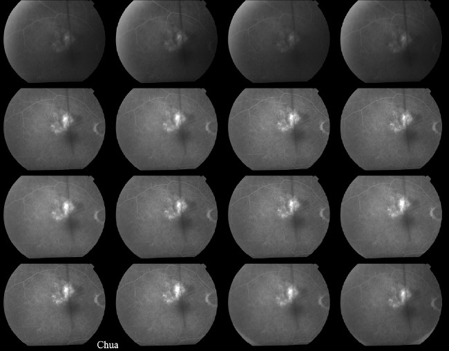 | History: A 75 year-old man was reviewed in the clinic 6 months after developing a retinal vein occlusion of a small vein supplying the macula. His vision had deteriorated from 6/9 to 6/18 because of an area of macular oedema with circinate exudate. A FFA was performed to localized the leakage; the leaking area was lasered with focal argon laser. His vision improved to 6/9 at 6-week follow-up. | |||