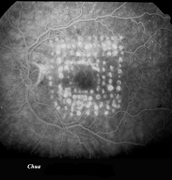 | History: This diabetic patient had had left grid lasers one year earlier for cystoid macular oedema. The oedema responded well to treatment. Although the lasers applied at the time was light without blanching, the fluorescein angiography shows up the areas of application. | |||