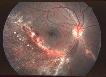 In the early stages, CMV retinitis may resemble cotton wool spots as seen in HIV retinopathy. However, unlike the cotton wool spots in HIV retinopathy which tend to be multiple and transient, the lesions seen in CMV retinitis tend to be solitary and show enlargement over time. The retinitis spread along the retinal vessels with white lesions and scattered haemorrhages. The involved vessels show sheathing. The retina behind the advancing edge may be atrophy. The vitreous is quiet and contains little cells.