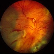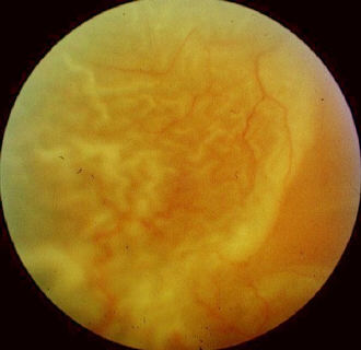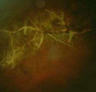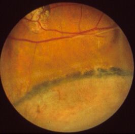 Note: The majority of the cases has treated retinal detachment possibly with proliferative vitreoretinopathy (PVR). Otherwise, the patient may be an in-patient awaiting surgery (the wearing of hospital pyjama may provide the clue). Another favorite case is long-standing retinal detachment usually with watermark. In treated retinal detachment, there is/are area(s) of chorioretinal atrophy with indentation from cryotherapy and explant. Examine the conjunctiva and comment if the explant is secured. Look for wrinkling of the retinal surface, vessel tortusosity and retinal folds suggesting the development of PVR. Examine the opposite eye for lattice degeneration and cryo/photocoagulation scars.