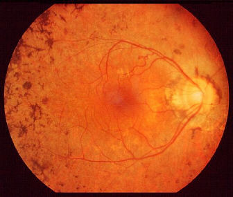 Retinitis pigmentosa showing the typical bone spicules pigmentary changes.There are multiple bone-spicules hyperpigmentation in the peripheral retina. In advanced cases,