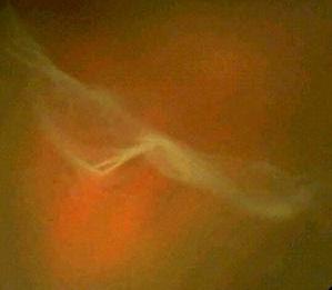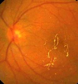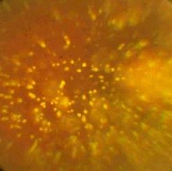The vitreous contains white or yellow refractile deposits dispersed through out the vitreous. The deposits are immobile despite movement of the eyes (because they are made up of calcium salts firmly attached to the vitreous fibrils). The retina view is obscured. Further examination: