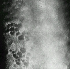 This is the specular photograph of a patient awaiting cataract surgery. The corneal thickness measures 0.65 mm with pachymeter and there is no clinical evidence of corneal oedema. What is responsible for the dark areas and what is the diagnosis? Answer The dark areas are caused by corneal guttata. The photograph shows decreased concentration of corneal endothelium. This is a case of early Fuchs' endothelial dystrophy. More questions