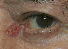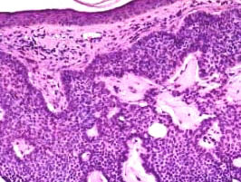 What is the diagnosis? Answer Basal cell carcinoma. The histology shows cells with hyperchromatic nuclei with peripheral palisading of the tumour. What are the treatment options for this condition? Answer Surgery. The definitive treatment is surgery leaving a clear margin of 3 mm to ensure complete excision. The defect is reconstructed with graft or flap. Cryosurgery. Low temperature is used to kill the cancer by freezing. Suitable for those who cannot tolerate surgery. Radiation. Chemotherapy. Topical application of 5-FU but the tumours here are too big and deep for this to be effective. Photodynamic therepy. This is suitable for patients with multiple superficial basal cell carcinoma such as Gorlin's syndrome. More questions